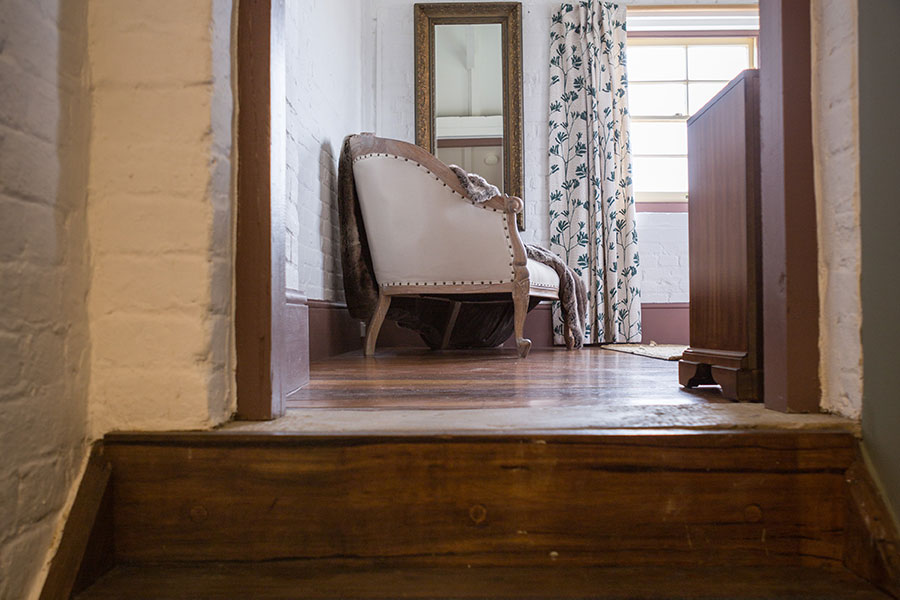The Hazell suite is the preferred bridal suite. With a beautiful chaise upstairs for the bride to relax in and a majestic restored 150 year old mirror, this suite has ample natural light for pre wedding preparations. Well positioned coat hooks have also been provided in the bedroom for the bride’s dress.